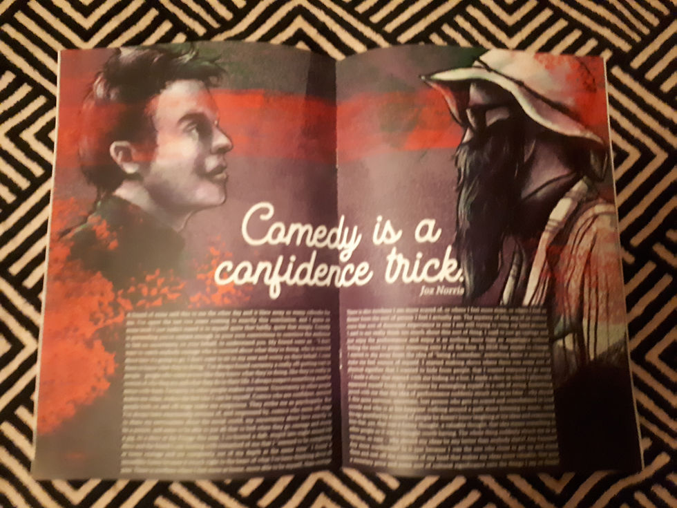 I wrote an article about the things that go on in my head that make me fall in and out of love with performing, and the amazing Lise Richardson has given it a big centrefold spread in Issue 3 of the Independent Comedy Appreciation Society Magazine, and done some really lovely illustrations of me and some guy!