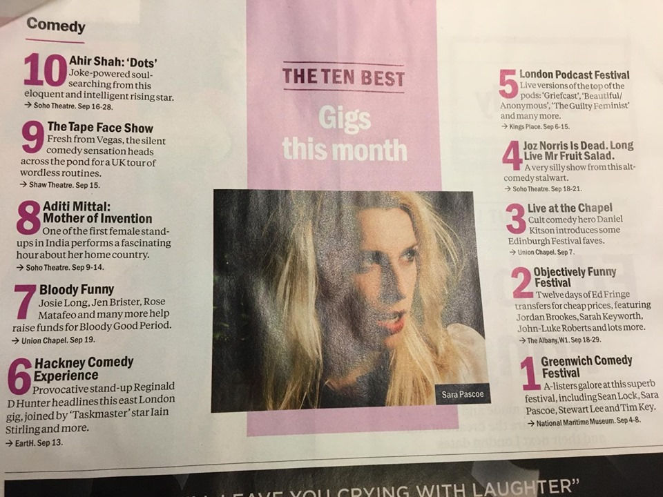 I am Number 4 in TimeOut's list of the top 10 comedy gigs in London this month, so many thanks to them for that. Their list of excellently curated choices is below, and you can book tickets for the Soho run here.